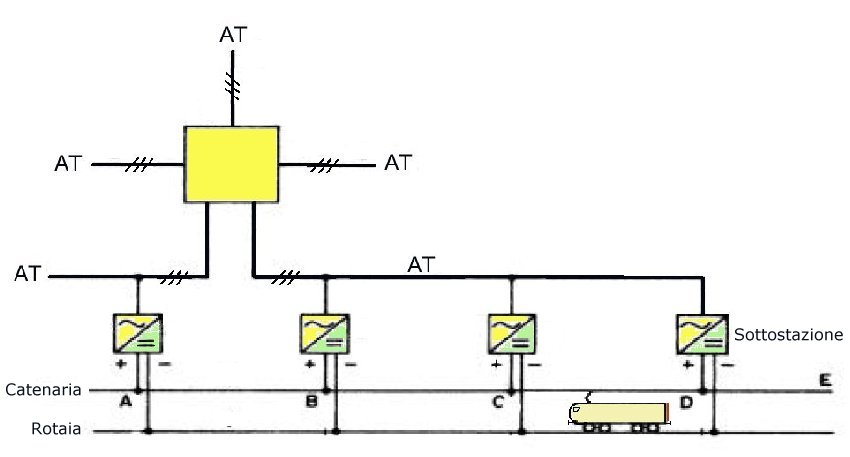 La Linea aerea fornisce un potenziale positivo (in Italia +3KV e +25KV per l'alta velocità) con il ritorno di corrente attraverso le rotaie.